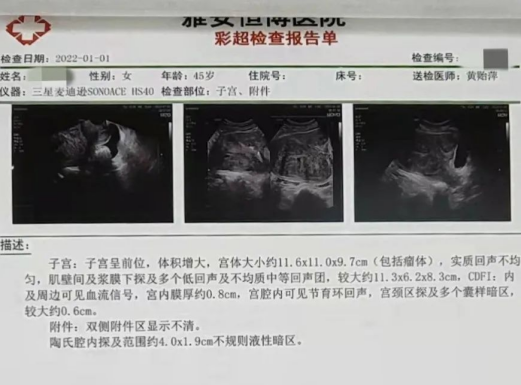 B超检查发现,张女士子宫存在多发性占位,肌壁间及浆膜下探及多个低回声及不均质中等回声团(较大约11cm)。