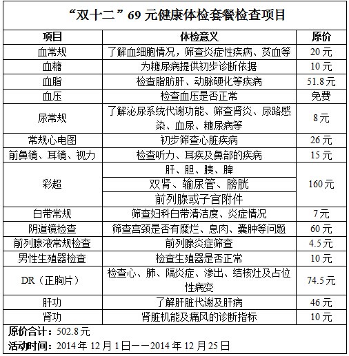 双十一刚刚过去,双十二就悄悄来临,雅安恒博医院考虑到广大朋友们双十一“血拼”后钱包“元气大伤”,特别推出“双十二”69元健康体检套餐,共包含15个检查项目。让广大朋友们开心健康地迎新年!