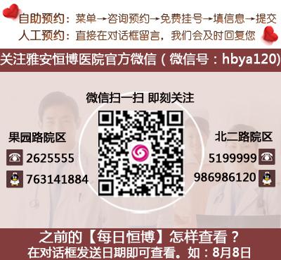 温馨提示:您可通过网上预约或电话预约的方式进行预约,关注雅安恒博医院官方微信:hbya120,也可以直接留言预约。