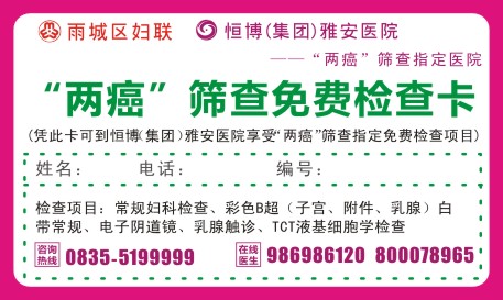 “两癌”筛查即是通过有效的检查手段,排查出受检者是癌症还是一般的妇科疾病,将有这两种危害女性健康的癌症尽早的排查出来。早检查、早诊断、早治疗是降低两癌发病率的重要手段。对“两癌”进行定期筛查,及早发现癌前病变或早期癌症,已被公认是癌症防治中最能有效提高患者生存率和生命质量的有效措施。为此,区妇联特携手恒博集团雅安医院深入乡镇免费为育龄妇女进行“两癌”筛查工作。