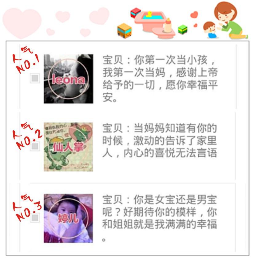 现本次活动人气高的前三位准妈妈已票选出(如下图示),她们将获得免费在我院做四维彩超,小编在此恭喜她们啦!