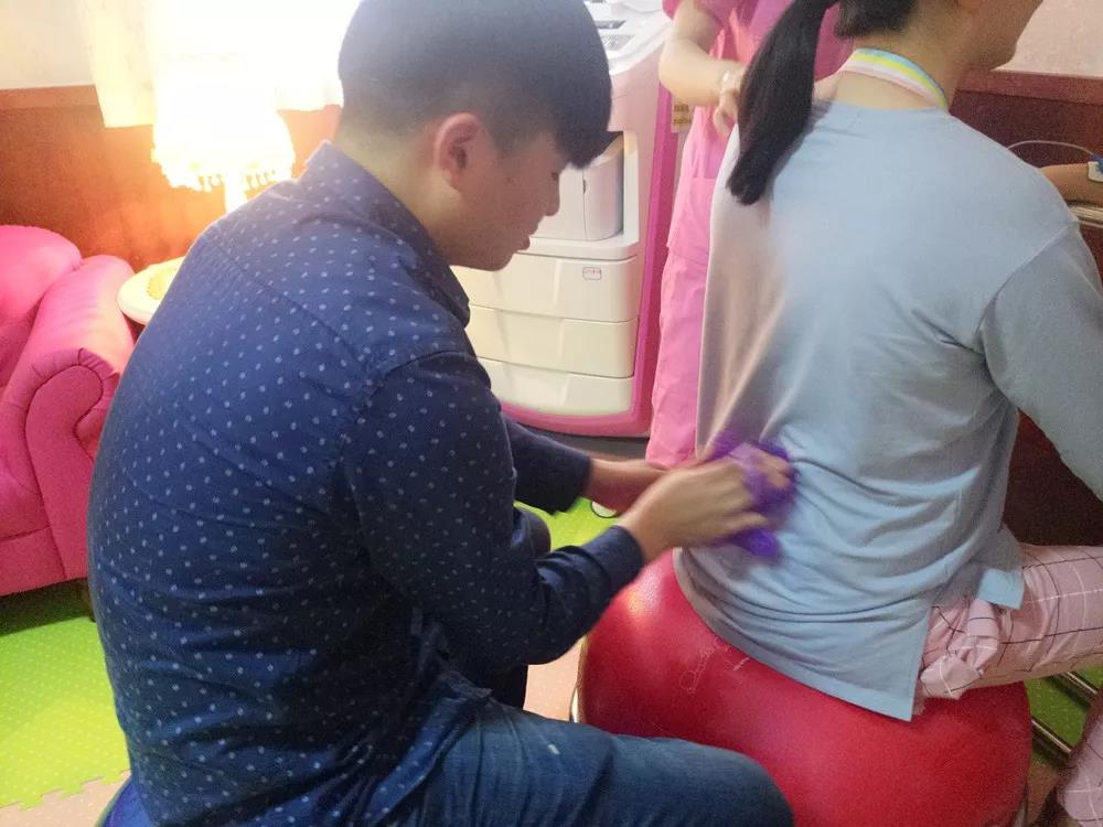 在这个过程中,准爸爸也没有闲着,在导乐师地指导下,不时的为巧巧按摩肩部和腰部,帮助巧巧放松。