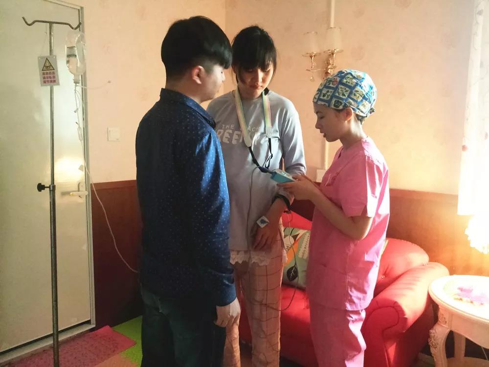 11:50,还不到1小时,巧巧的宫口已经开到5指。导乐师小杨开始带领巧巧进行自由体位,并根据巧巧的身体情况为她调整快乐分娩镇痛仪。