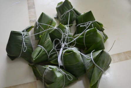 下午2点,比赛正式开始,大家围在一起,纷纷拿出看家本领。只见大妈们灵巧的双手上下翻飞,将糯米、绿豆在粽叶中填满扎牢;小姑娘们毫不怯场,边看边学,逐渐从生到熟;不少老奶奶更令人鼓掌叫绝,捋粽叶、做漏斗状、填糯米、压紧实、封口、扎捆,三角形、牛角形等形态各异的粽子迅速成型。