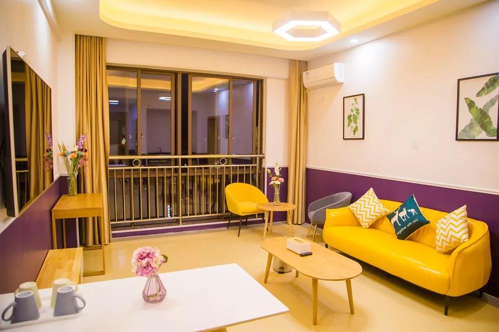 客厅配有高清智能电视机、两种休闲沙发、还有专门的茶歇吧台。