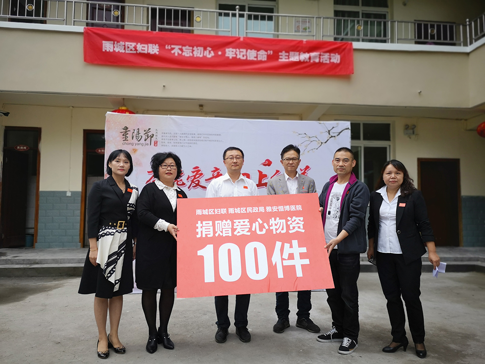 活动中,雨城区妇联、区民政局、雅安恒博医院联合向福寿敬老院捐赠爱心物资100件。
