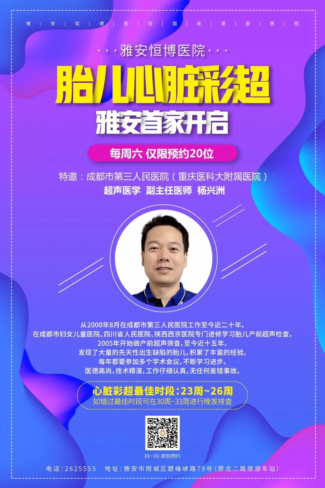 于每周六在雅安恒博医院妇产医院院区开启胎儿心脏彩超检查。
