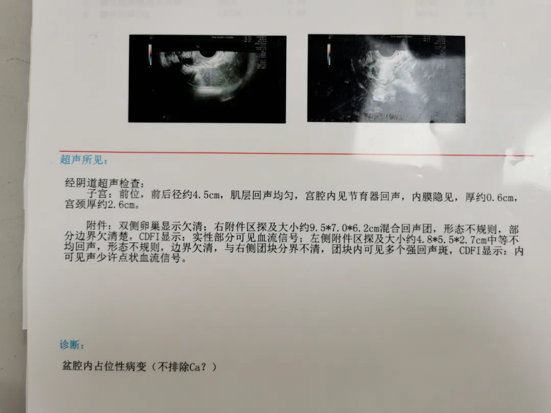 结果示:左侧附件4.8×5.5cm中等不均匀回声,右侧附件9.5×7.0cm混合回声团,提示