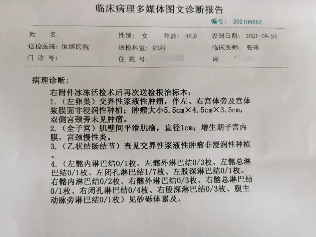 冷院长表示,周女士双侧附件包块都属于是卵巢交界性浆液性肿瘤,简单的说就是一种在