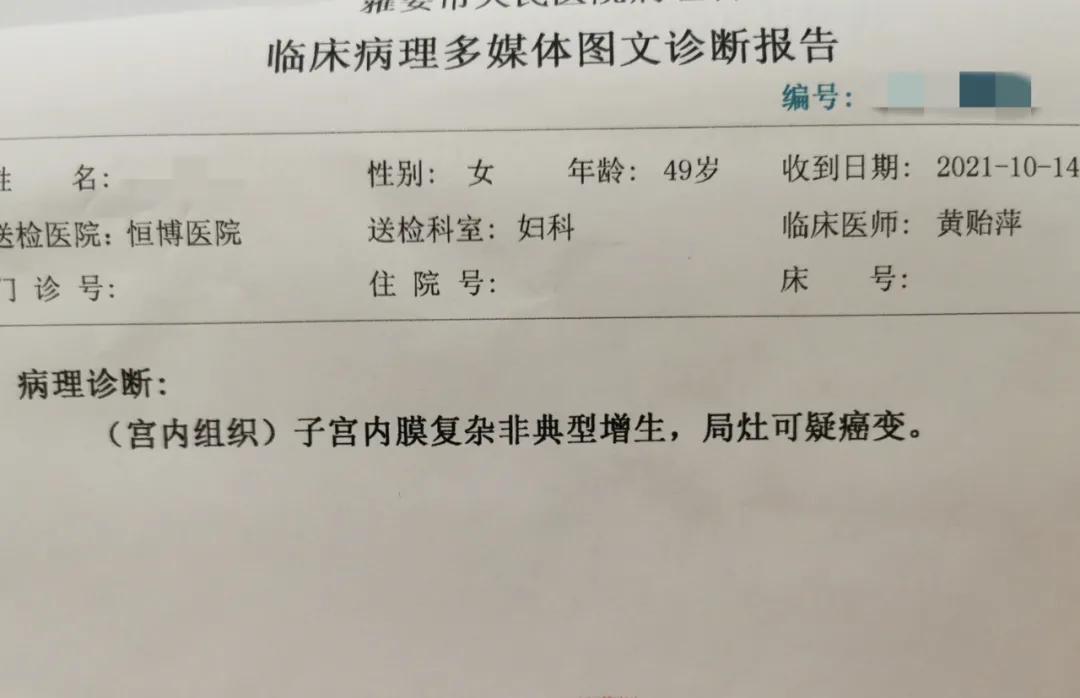 然而果不其然,病理检查报告提示:(宫内组织)子宫内膜复杂非典型增生,局灶可疑癌变!