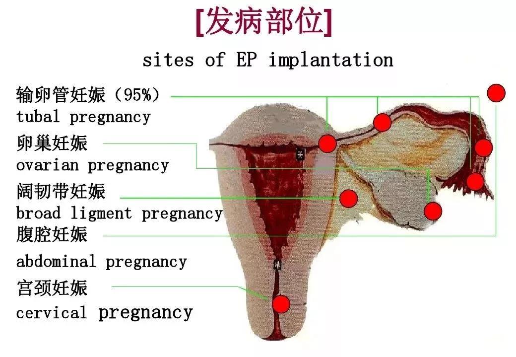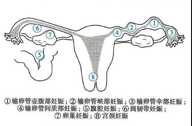 而异位妊娠是指受精卵在子宫体腔以外的地方着床,以输卵管妊娠最为常见(95%),其他有卵巢妊娠、腹腔妊娠、宫颈妊娠、阔韧带妊娠、剖宫产瘢痕部位妊娠等。